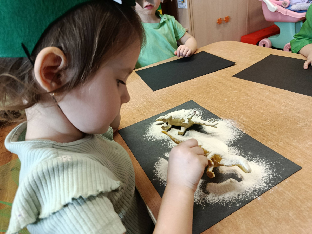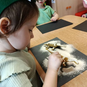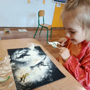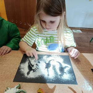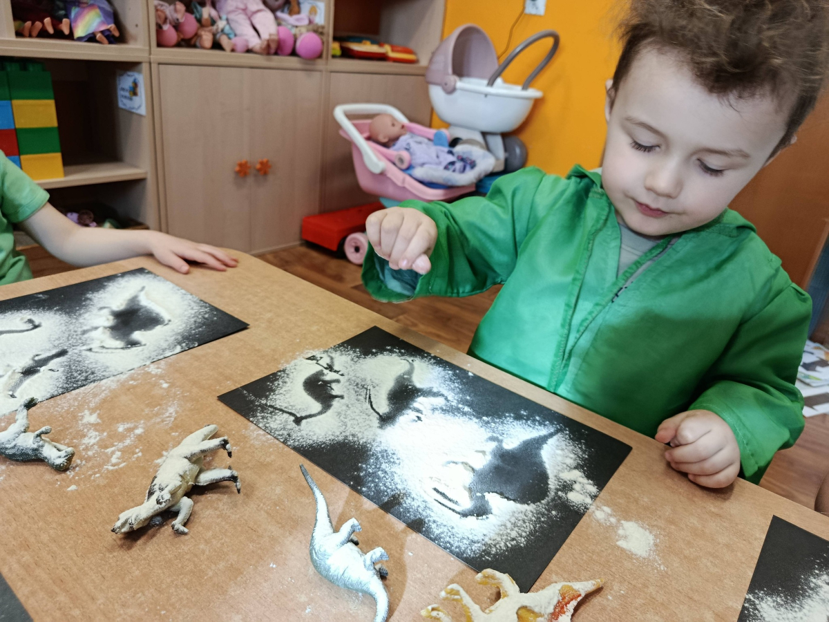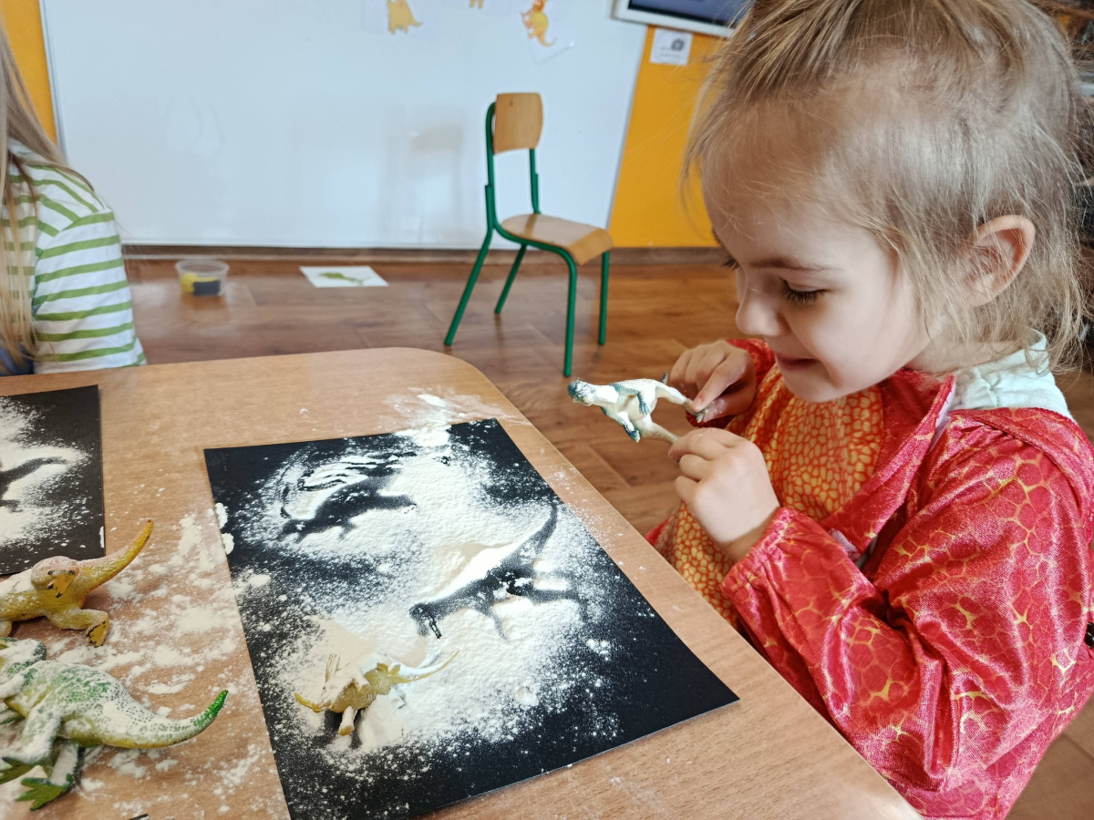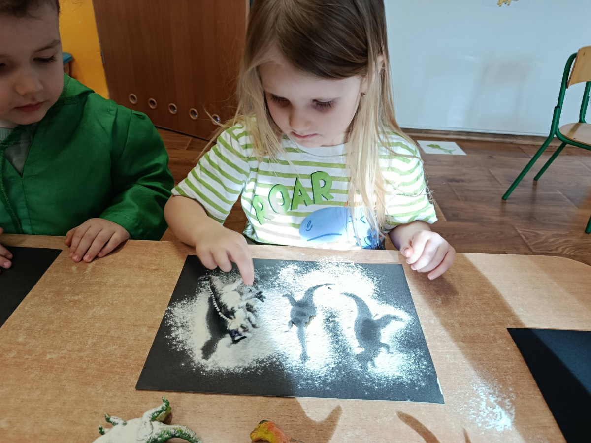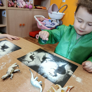 Podczas zajęć dzieci brały udział w aktywnościach matematycznych – przeliczały dinozaury, porównywały ich wielkość oraz układały zbiory. Rozmawialiśmy także o budowie dinozaura i jego charakterystycznych cechach. Dużym zainteresowaniem cieszyła się zabawa sensoryczna – tworzenie cieni dinozaurów z mąki.