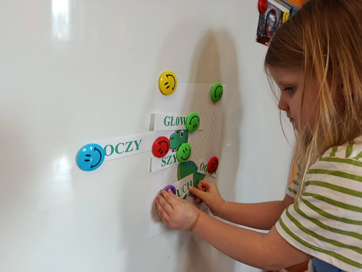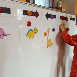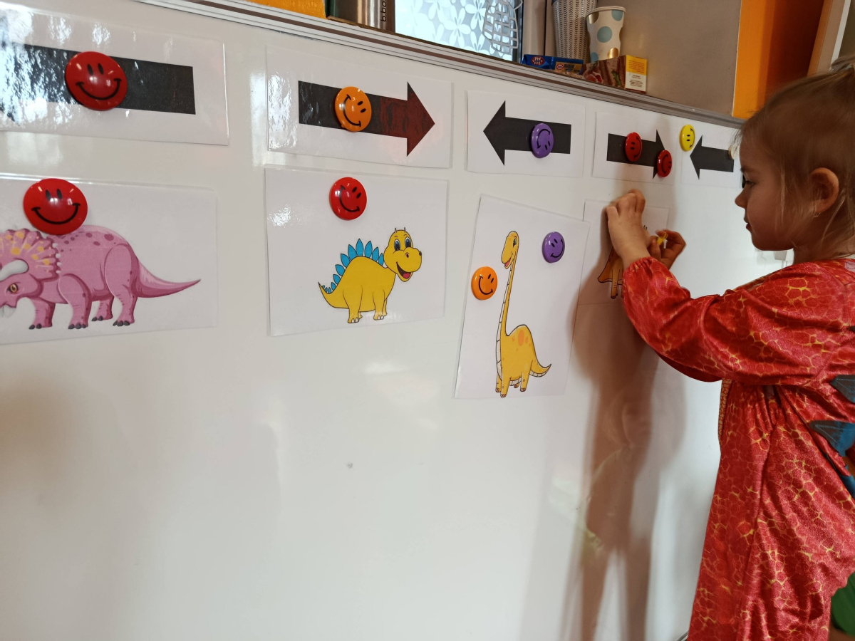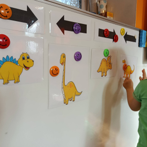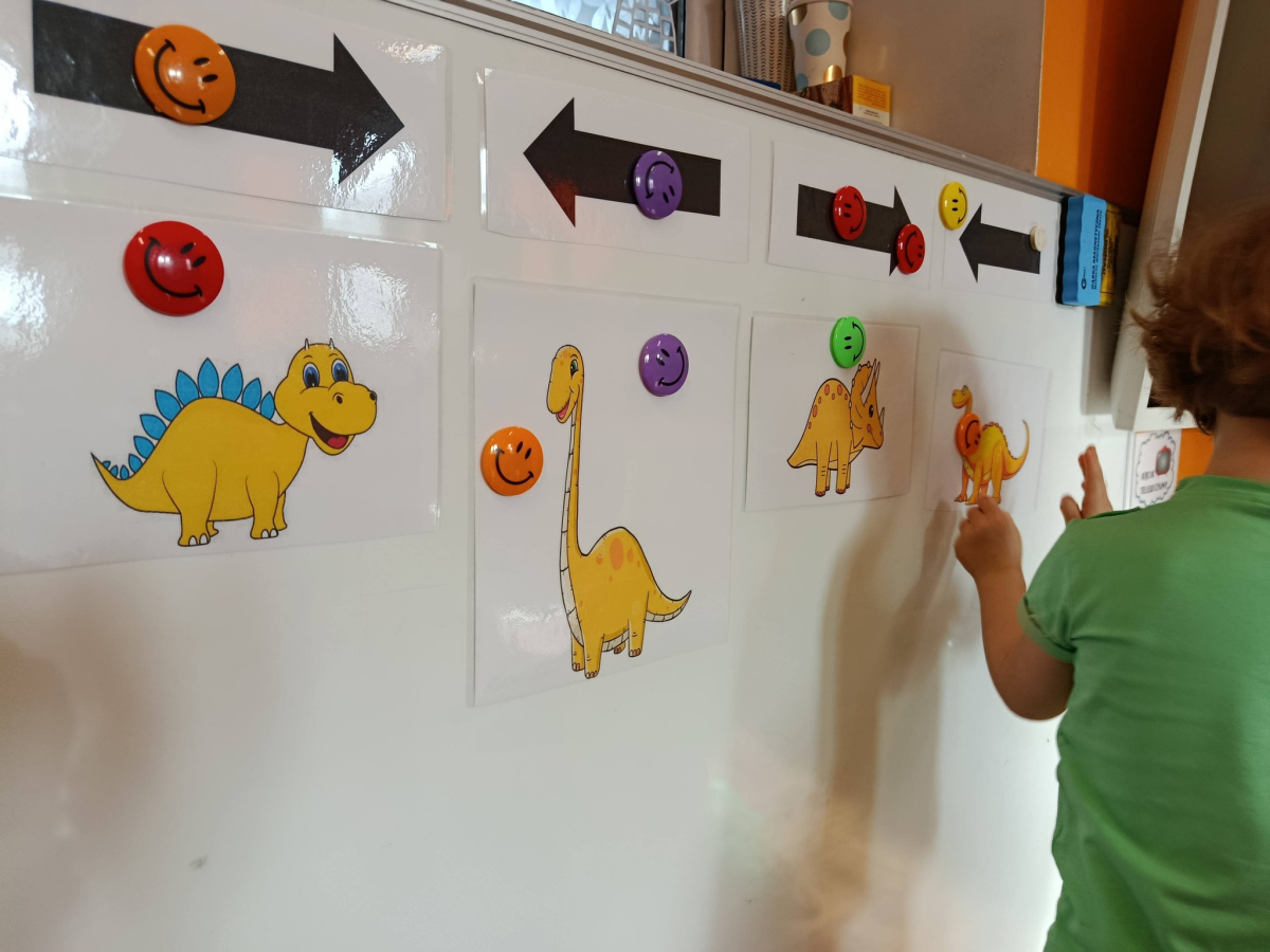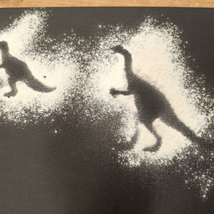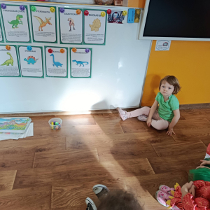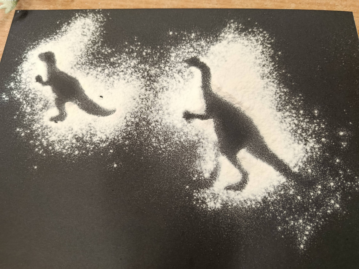 Podczas zajęć dzieci brały udział w aktywnościach matematycznych – przeliczały dinozaury, porównywały ich wielkość oraz układały zbiory. Rozmawialiśmy także o budowie dinozaura i jego charakterystycznych cechach. Dużym zainteresowaniem cieszyła się zabawa sensoryczna – tworzenie cieni dinozaurów z mąki.