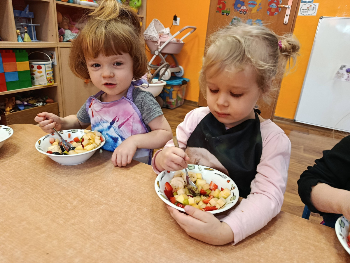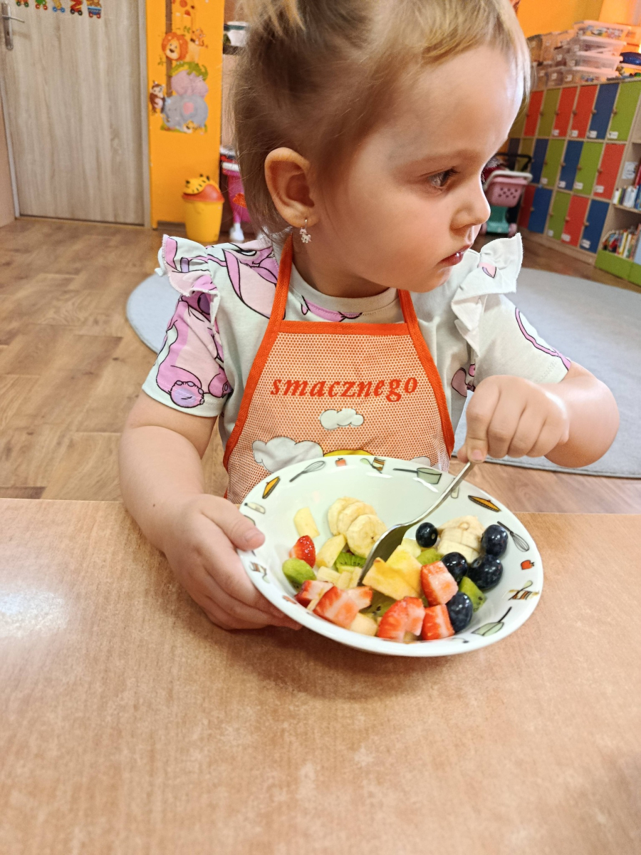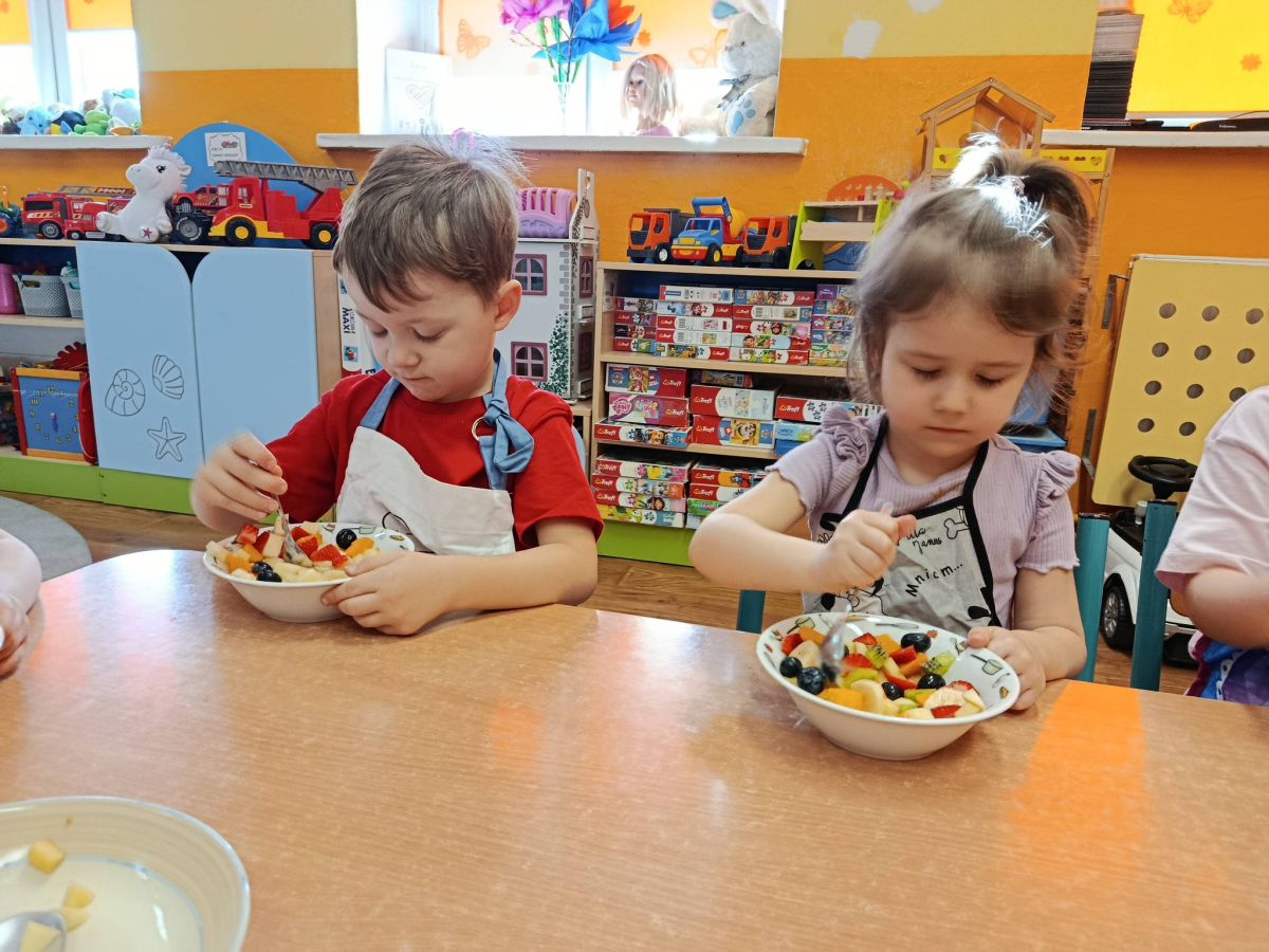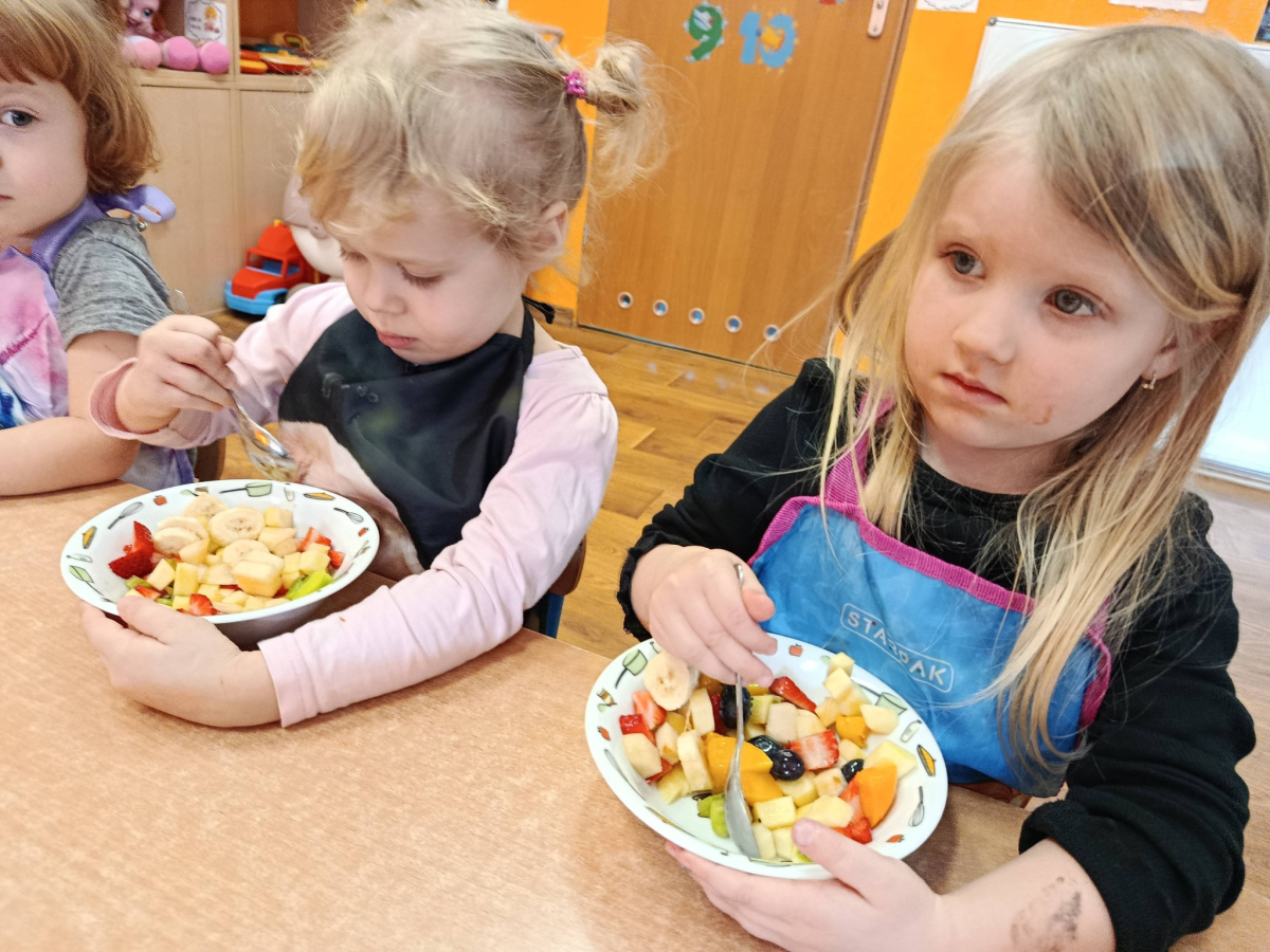 Na początku dzieci dokładnie umyły ręce i założyły fartuszki. Rozmawialiśmy o tym, dlaczego warto jeść owoce i jakie witaminy się w nich znajdują. Przedszkolaki nazywały owoce, rozpoznawały je po wyglądzie, zapachu i smaku oraz określały ich kolory i kształty. Na zakończenie odbyła się wspólna degustacja. Dzieci z dumą próbowały własnoręcznie przygotowanego deseru i dzieliły się wrażeniami smakowymi.