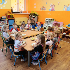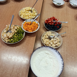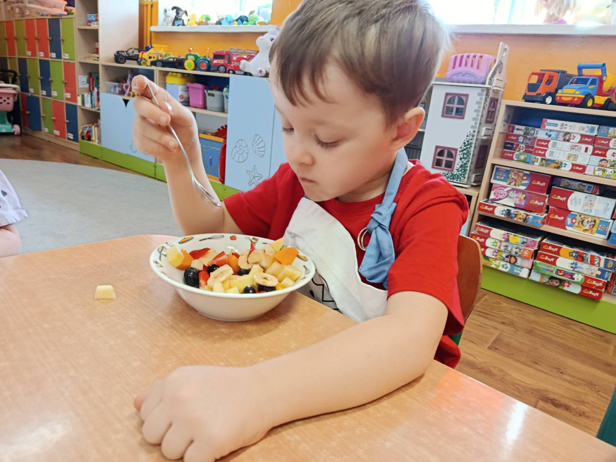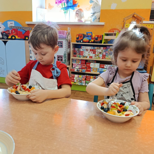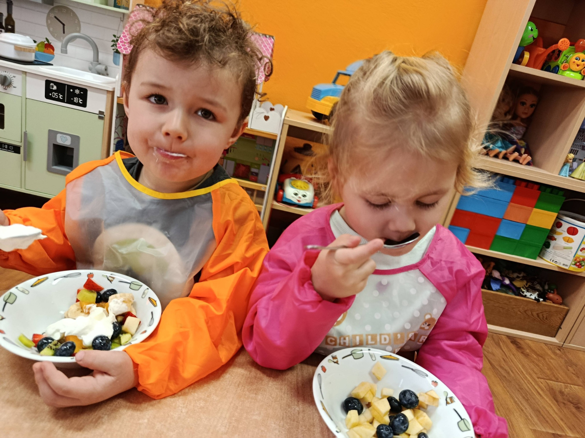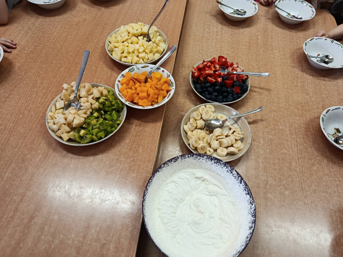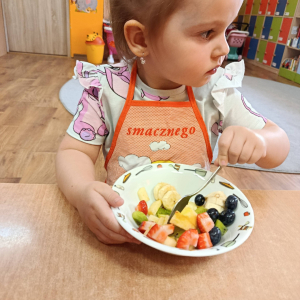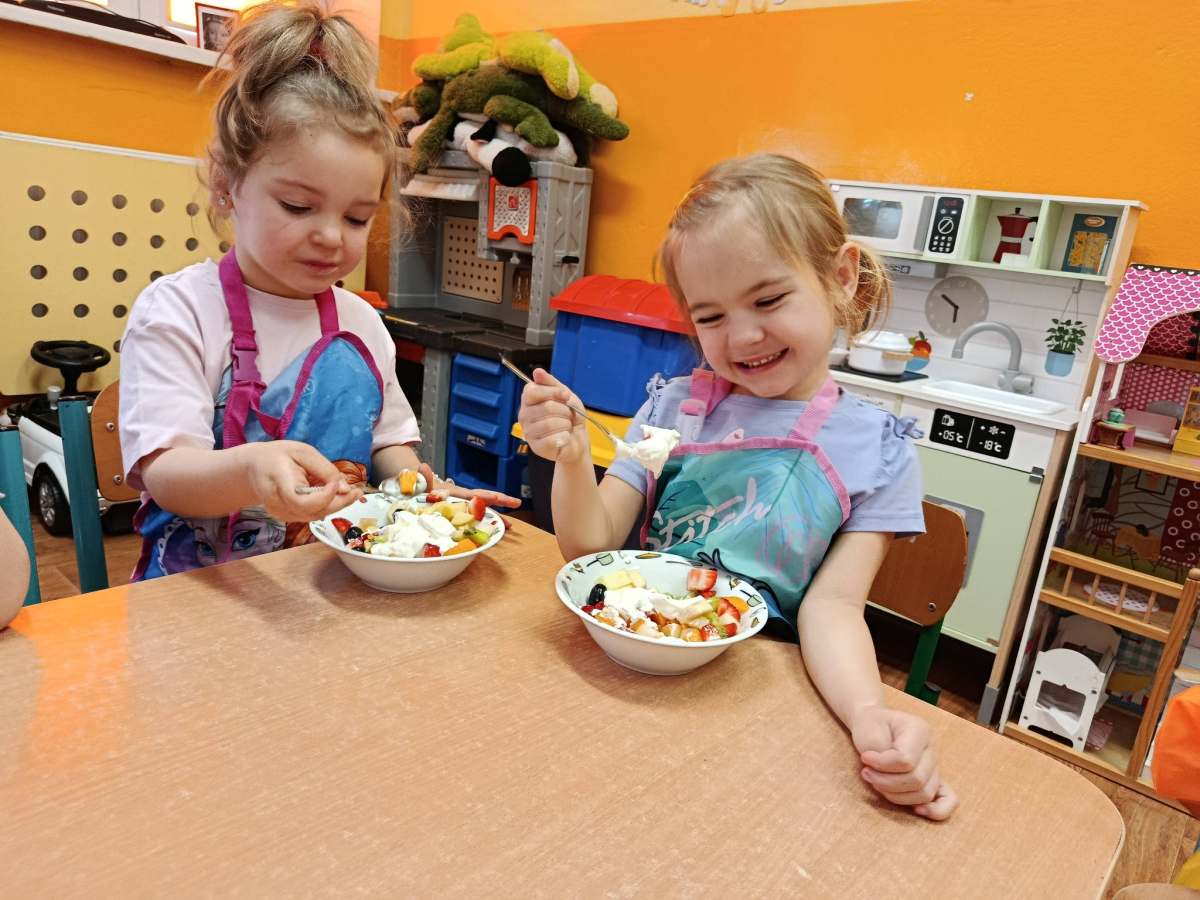 Na początku dzieci dokładnie umyły ręce i założyły fartuszki. Rozmawialiśmy o tym, dlaczego warto jeść owoce i jakie witaminy się w nich znajdują. Przedszkolaki nazywały owoce, rozpoznawały je po wyglądzie, zapachu i smaku oraz określały ich kolory i kształty. Na zakończenie odbyła się wspólna degustacja. Dzieci z dumą próbowały własnoręcznie przygotowanego deseru i dzieliły się wrażeniami smakowymi.